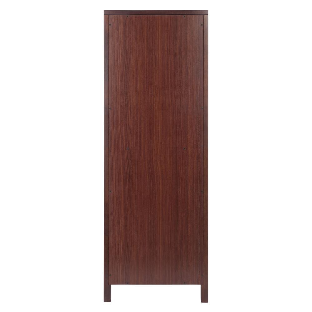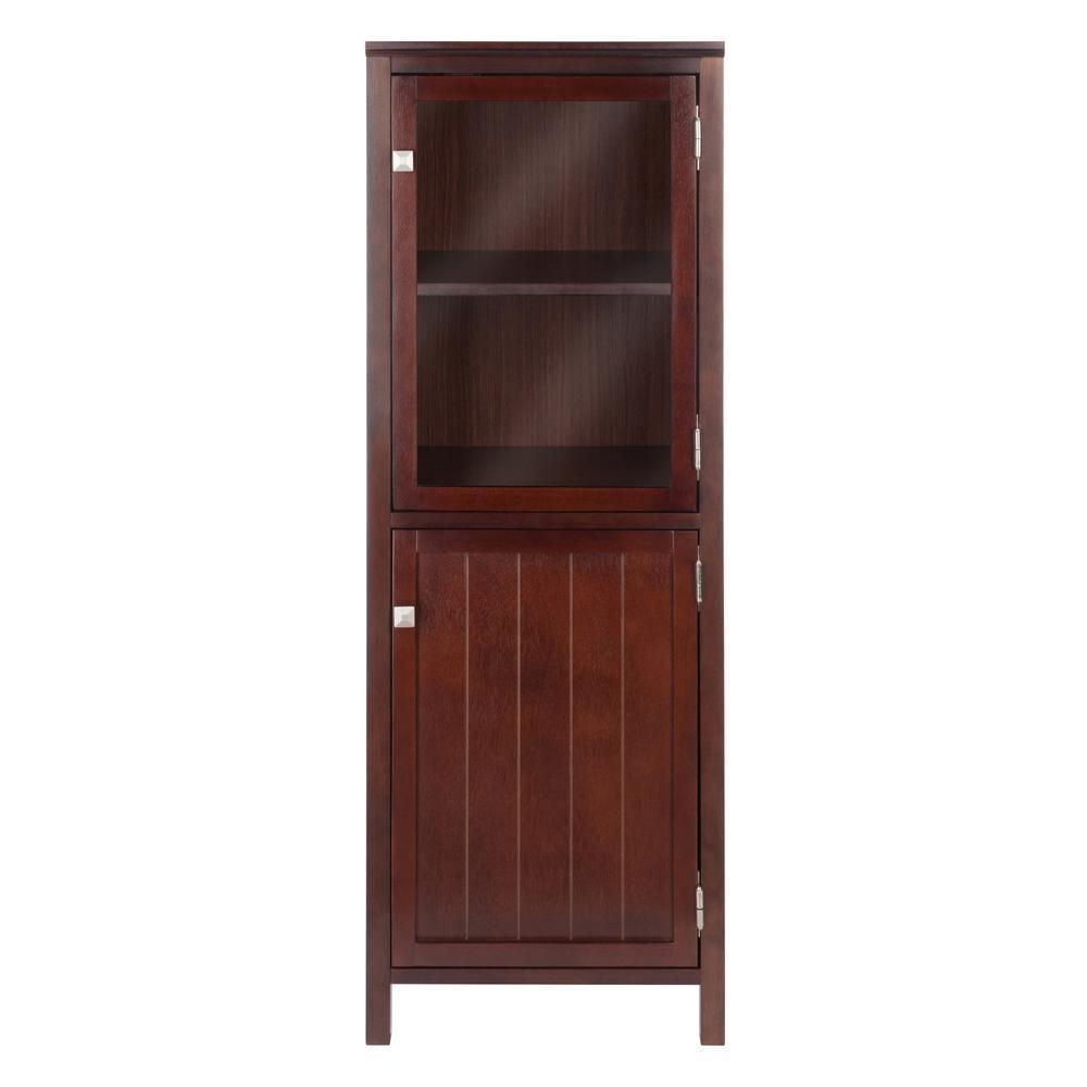 Farmhouse styling in a versatile storage piece Upper cabinet has tempered glass door Wainscoting panels on lower cabinet door Both sections have removable shelves Warm walnut finish Combine with any of Winsome’s Brooke Jelly Cupboards for additional storage Assembly required Ships in 1 box