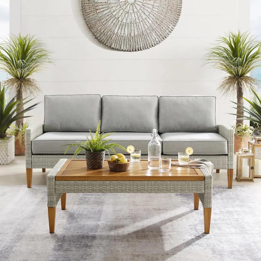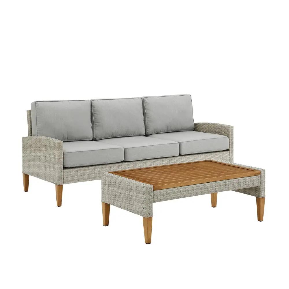 Bring coastal swagger to outdoor relaxation with the Capella 2pc Sofa Set. Blending cool neutral tones with natural finishes, this set is sure to be the talk of the party. All-weather resin wicker and quick-drying olefin fabric come together to create durable outdoor seating. With a stylish mix of elements, the coffee table pairs resin wicker with a slatted steel top hand-painted to look like wood. The sofa and coffee table also have sturdy steel tapered legs that resemble real wood, making the Capella 2pc Sofa Set durable and unique.