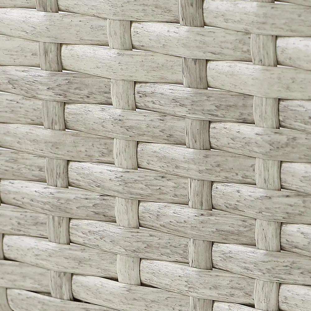 Modern coastal design UV resistant all-weather reed style flat resin wicker Weather-resistant powder-coated steel frame Handwoven gray resin wicker outdoor furniture Gray outdoor cushion covers Steel tapered legs are hand-painted, offering a natural wood look with better durability than traditional wood furniture Patio table has a slatted steel tabletop with a hand-painted wood finish which adds more durability than a standard wood top Quick-drying olefin fabric cushion covers resist mildew and sun fade to keep your outdoor patio furniture looking good Moisture-resistant high grade cushion cores 4.5″ thick seat cushion and 3.5″ thick back cushion Seating for up to three Sofa Dimensions: 33″H x 75.75″W x 29.5″D Coffee Table Dimensions: 15.5″H x 43.25″W x 24″D Wicker coffee table weight limit is 50lbs