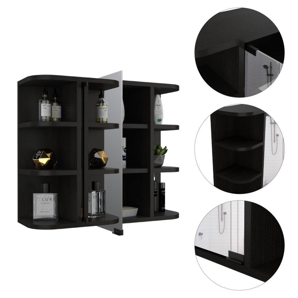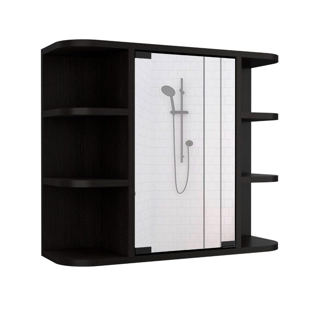 The Milano Medicine Cabinet is an elegant and functional piece that with a mirrored cabinet door and multiple exposed rounded shelves will provide you with a great product for your bathroom and safe from harmful edges. Three open shelves on each side, a mirror panel door in the center for extra privacy, and three center shelves make up the center console. Designed with Black Wengue manufactured wood.